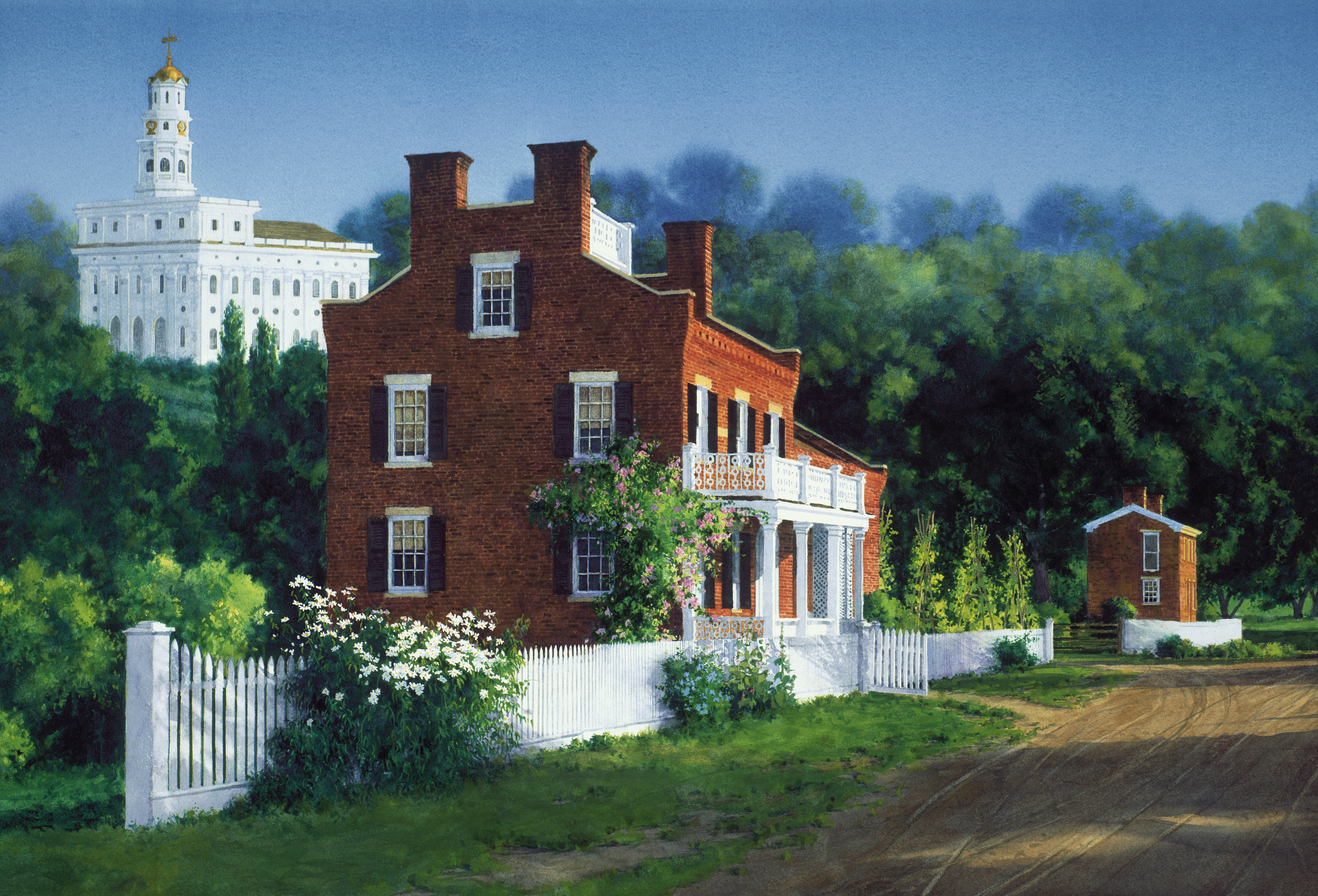 This painting portrays the Heber C. Kimball Home located in Nauvoo, with the Nauvoo Temple present in the background and the Farr Home in the lower right. Before building this beautiful brick home in 1845, Heber C. Kimball and his family lived in a small log and brick home on the back of their property. Five months after moving into their new home, the family had to abandon it because of mob violence and head west with the saints.